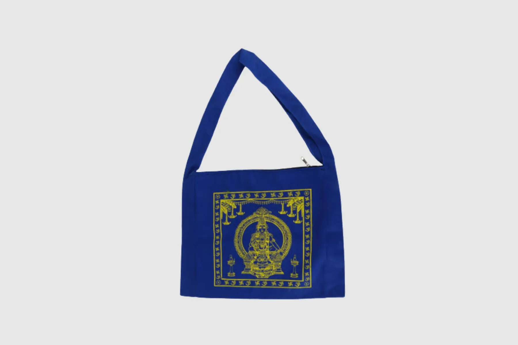 By using components that are recognizable to devotees and have spiritual meaning, the bag’s design honors the holiness of the sabarimala pilgrimage.