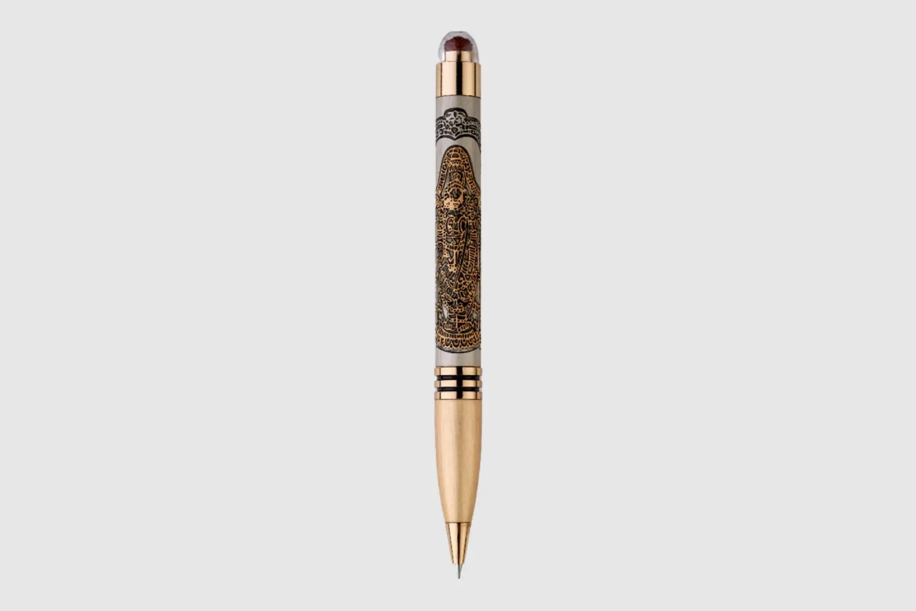 - Elevating the design further, the pen is adorned with Rudraksha studs, creating a visually appealing and tactile texture. Each Rudraksha adds a symbolic and spiritual element to the pen, making it more than just a writing instrument.
