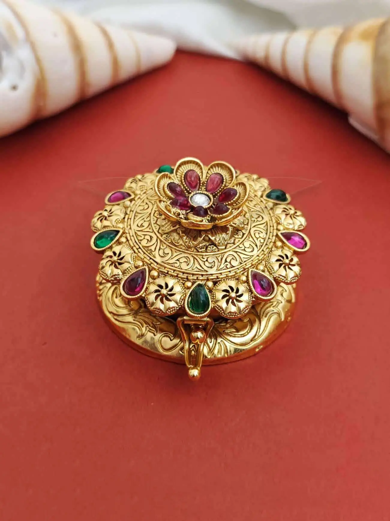 We built this box to be both beautiful and useful. However, it is also compact. For example, we hand-set it with lovely red and green stones. And it keeps your sindoor safe and clean. In short, it is a wonderful and thoughtful gift.