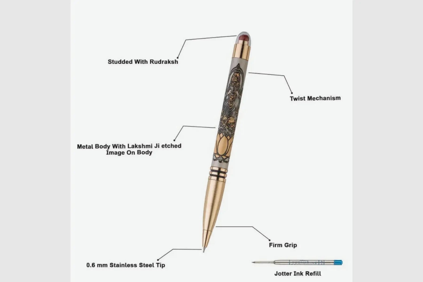 - The pen boasts a unique and exquisite design, featuring an intricate Lakshmi etching that adds a touch of cultural and artistic flair to its appearance.