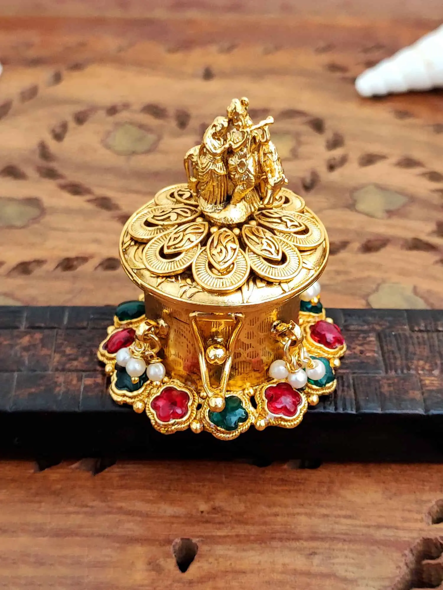 We make this box with an antique, gold-plated finish. This means it has a timeless, royal look. Also, it features a miniature idol of the holy Radha Krishna. Because of this, it is a very special item to keep in your pooja room.